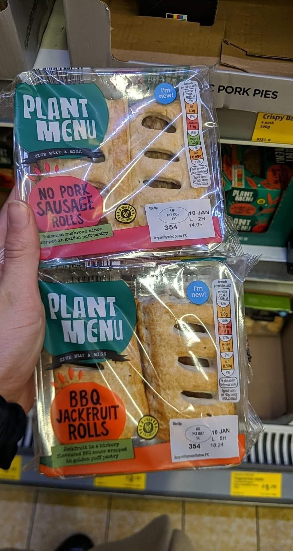 Plant based tuna.. Pains au Chocolate.. Chunky Chocolate Chip Cookies.. Chocolate Spread.. Sausage Rolls.. Jackfruit Rolls.. Curry Pie.. Mushroom Mince