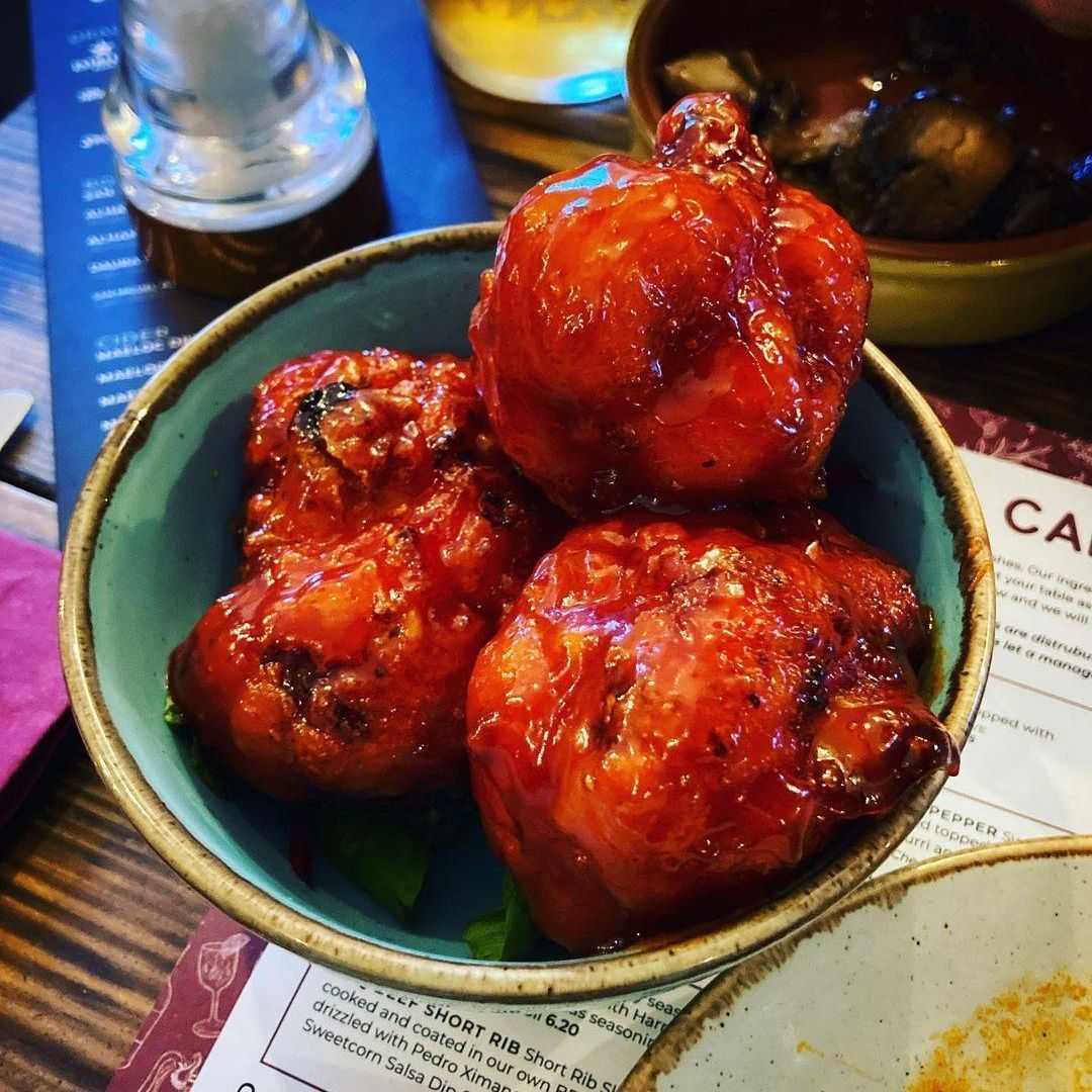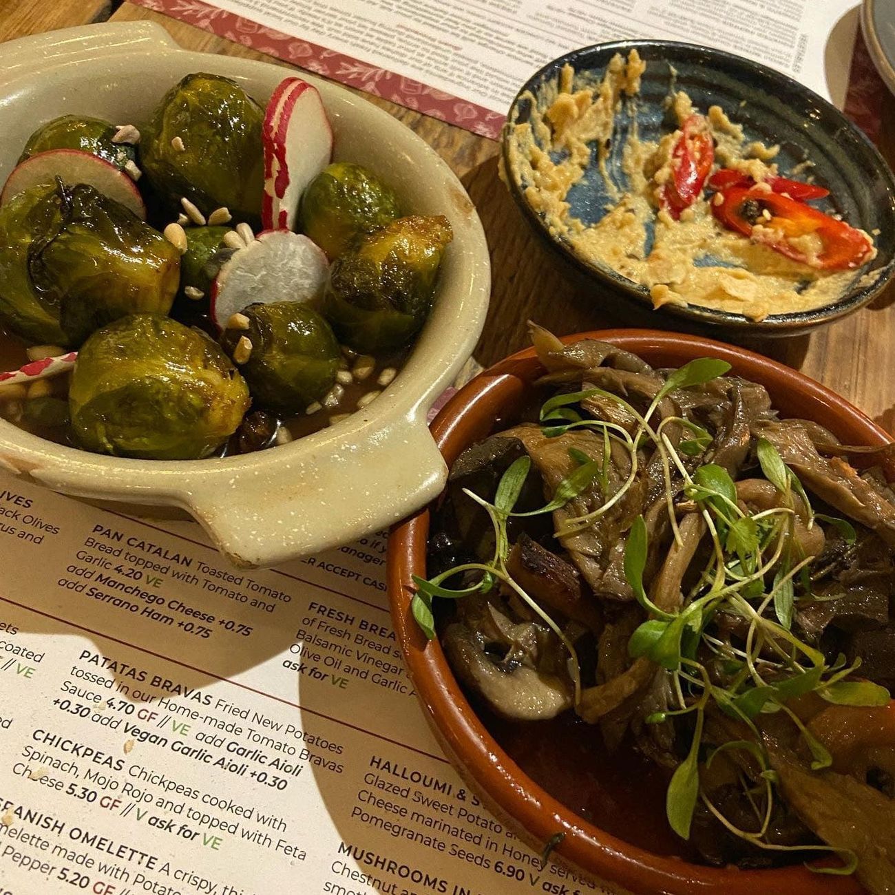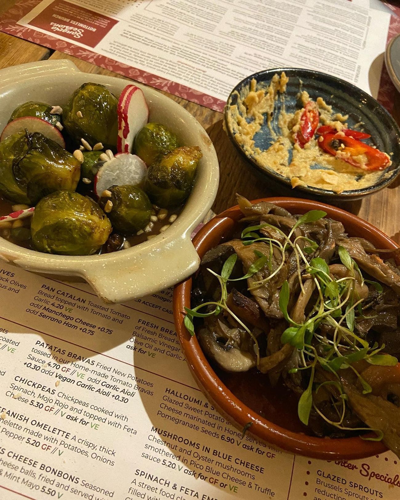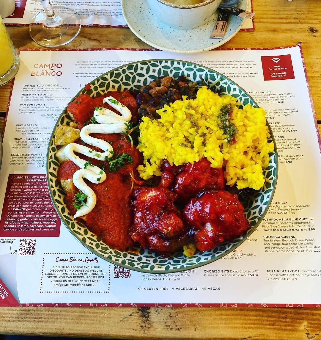 Tonight we ate at campo blanco in whitefield. The vegan options were great! We had hummus and flatbread, cauliflower wings (the nicest I’ve ever had!) garlic mushrooms, sticky sprouts and Patata‘s Bravas. Would highly recommend.