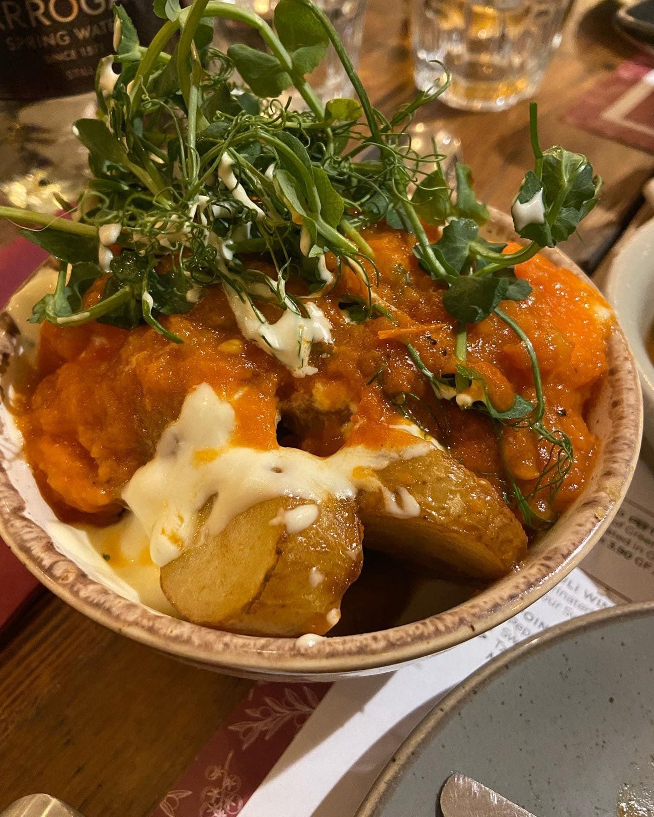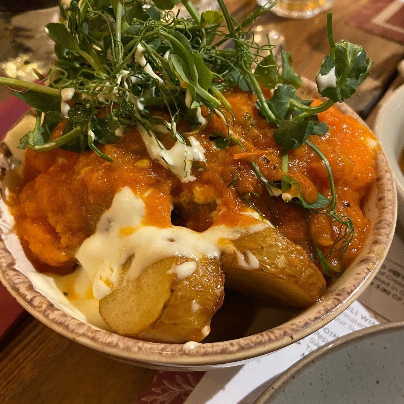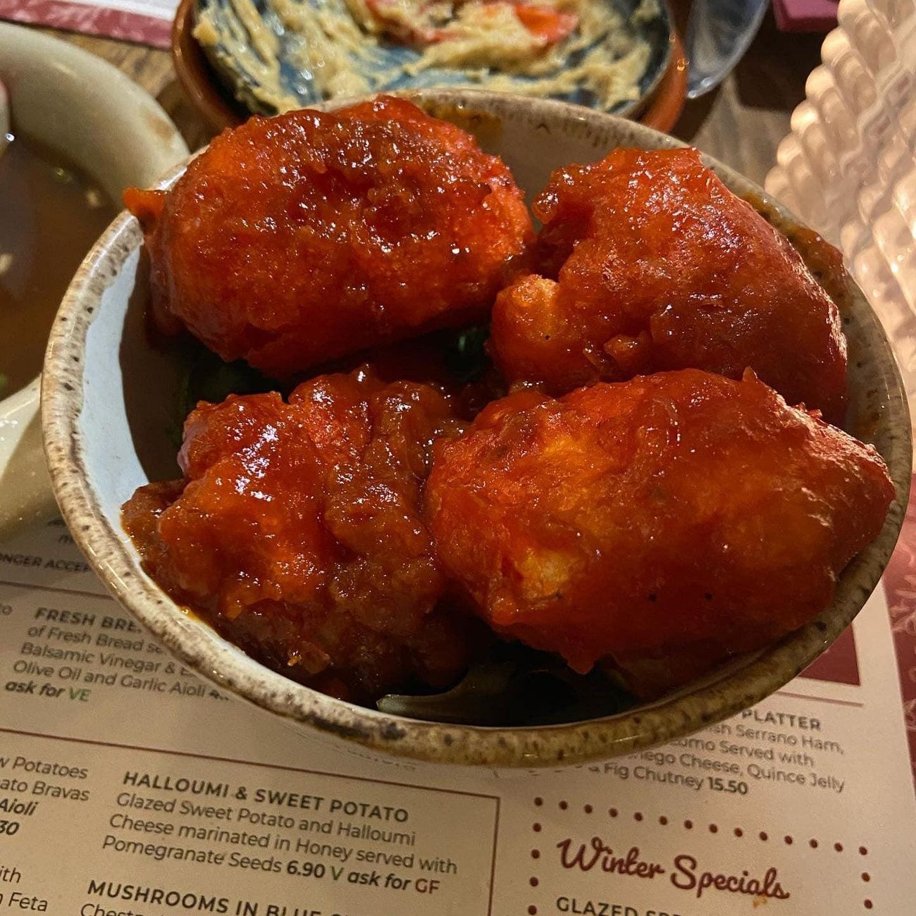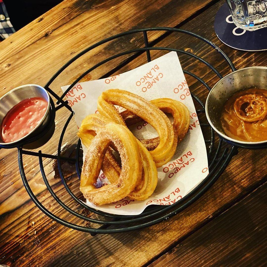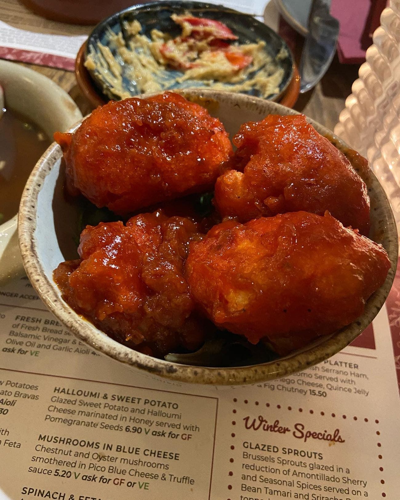 Tonight we ate at campo blanco in whitefield. The vegan options were great! We had hummus and flatbread, cauliflower wings (the nicest I’ve ever had!) garlic mushrooms, sticky sprouts and Patata‘s Bravas. Would highly recommend.