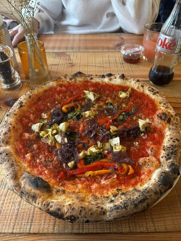 I went last night and had the marinara (no cheese) and extra toppings. Got the chilli honey dipping sauce and it was delicious! Really nice inside- we had a great quick dinner with the kids.