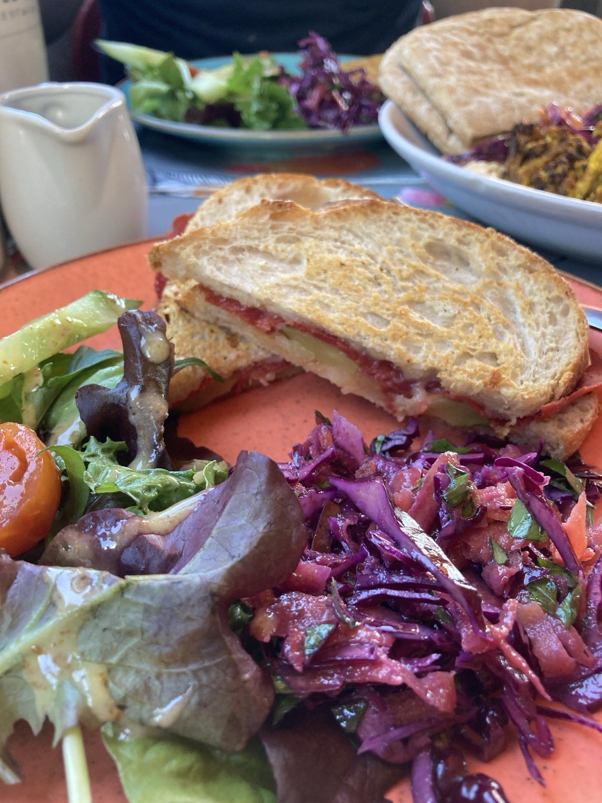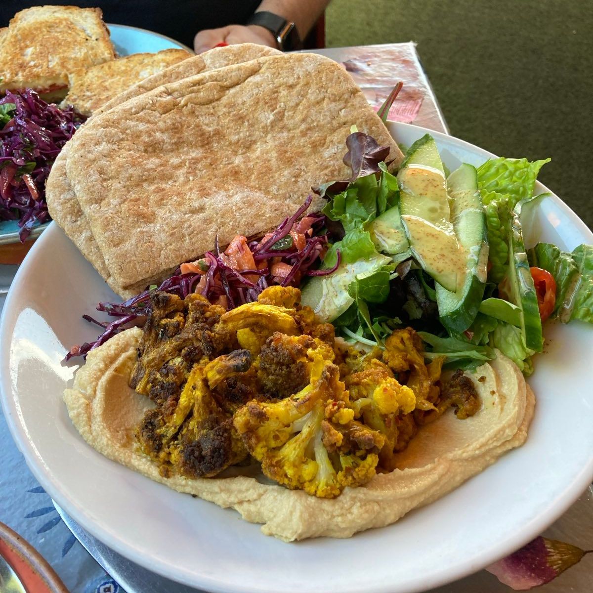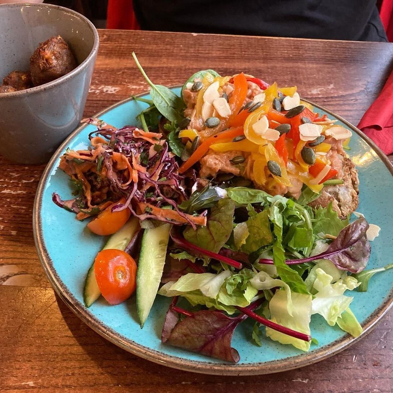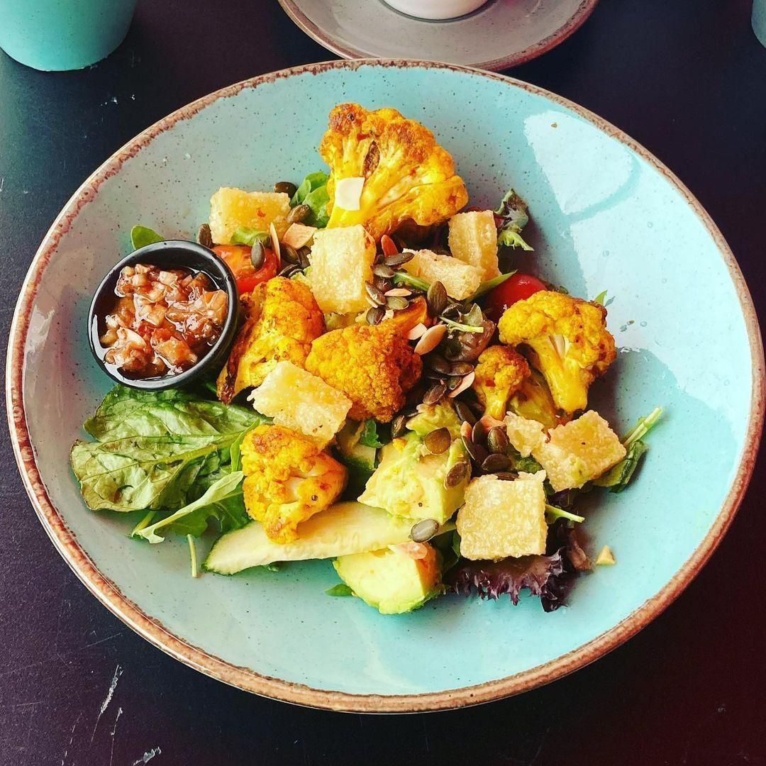 New fave! Cauliflower and vegan halloumi salad from @coffeesackprestwich- you have to ask for vegan halloumi, which comes nicely crisped up. Yum!