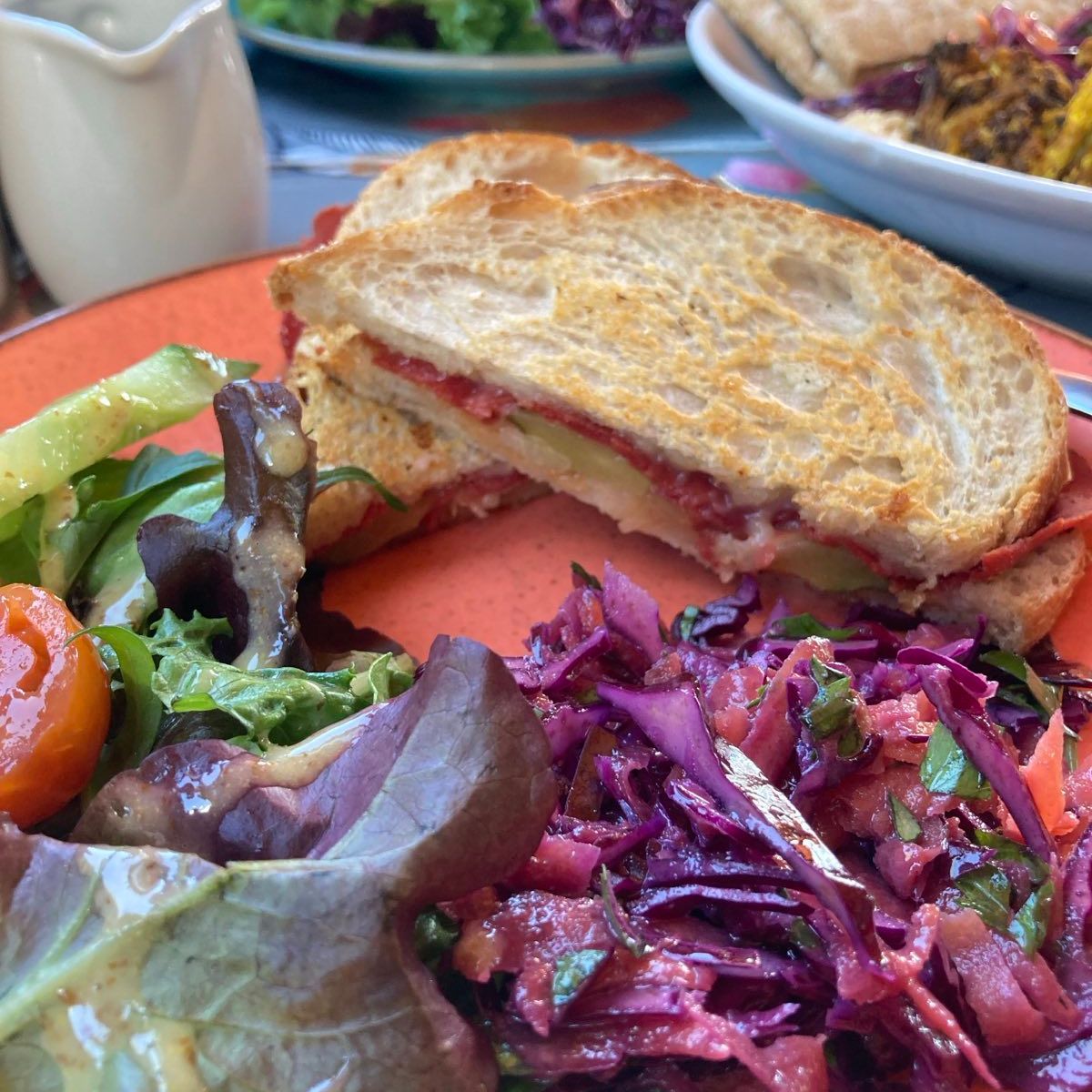 We had the new (I think?) vegan reuben sandwiches from the Coffee Sack yesterday - well good! vegan pastrami, pickle, melty cheese, Russian sauce, it was A++. and we had the roasted cauliflower bowl too. and, not pictured, pecan cinnamon swirls and biscoff cookie!
