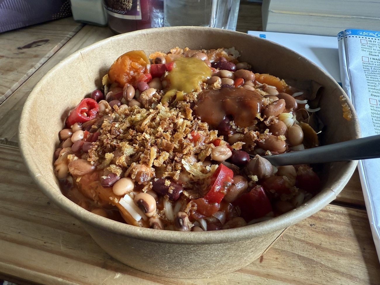 Picked up lunch from Sweet Potatoe opposite Besse's, as recommended in here the other day - well tasty! And you get sooo much for your money. Highly recommend the three bean chilli.