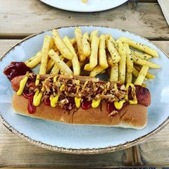 Vegan hot dog with a view at the Same Yet โ๏ธ This is a special theyโve got on at the moment but they do a tasty Thai vegan burger and hoisin mock duck wrap on their main menu as well.